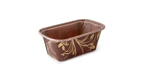 The 100 grams plum cake mold is a rectangular single-dose cooking mold made out of cardboard that can be used for baking.